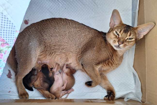 FI*Kermakupin Sä muistatko metsätien ”Lara” gave birth to four healthy kittens soon after midnight on February 18th. The delivery was natural and rather easy. We are especially excited about the sorrel kittens as we have not had that color in our cattery for a good while.